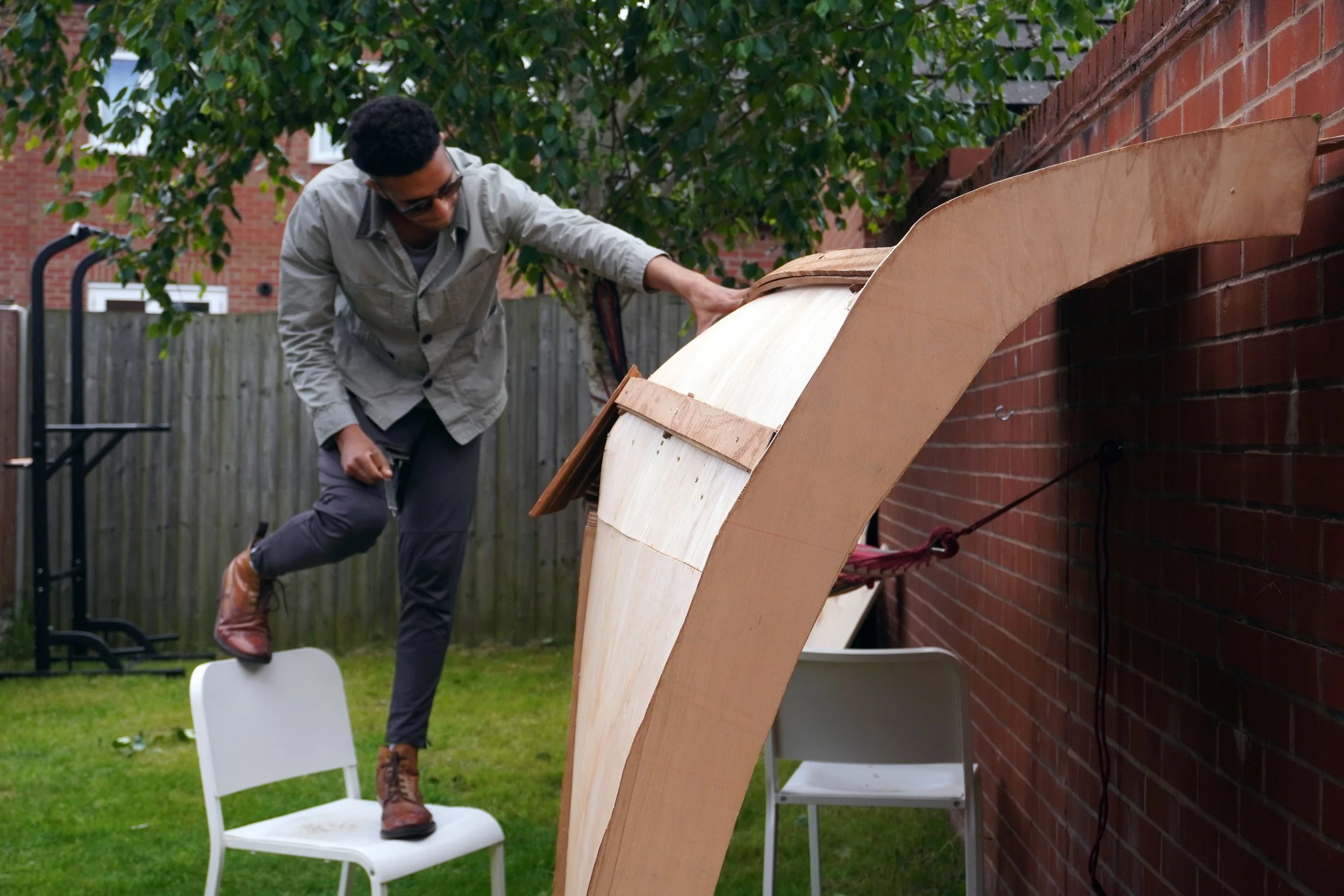Testing the construction of the Monocoque Cabin through a full-scale 1:1 model. This prototype allowed us to study how the shingles would curve and wrap around the structure, ensuring the design was both buildable and true to its intended form.
