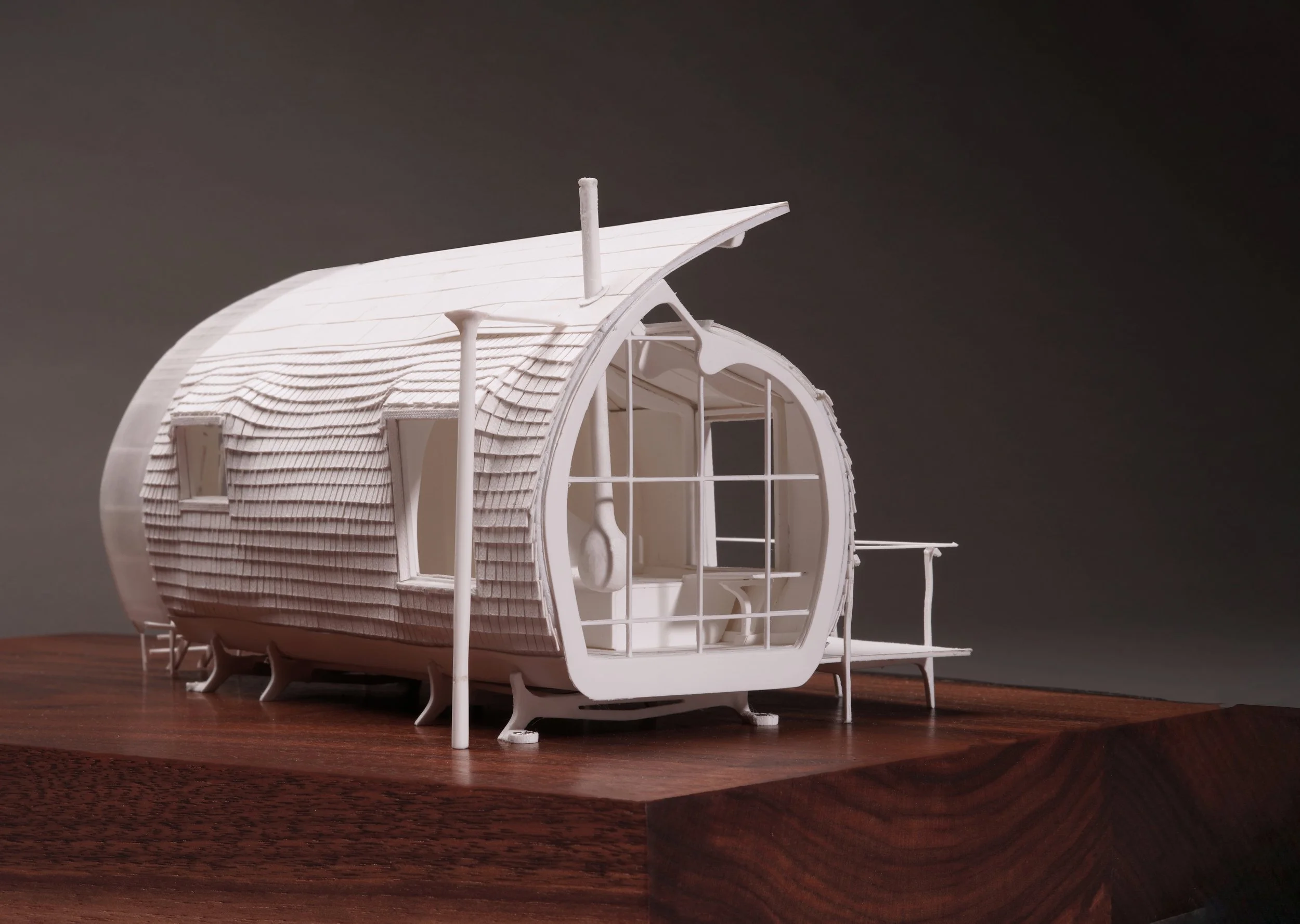 A detailed presentation model of our Monocoque Cabin project. This model played a key role in communicating the concept to investors and was instrumental in securing project funding. Physical models like this help convey the craftsmanship and ambition that go into each design.