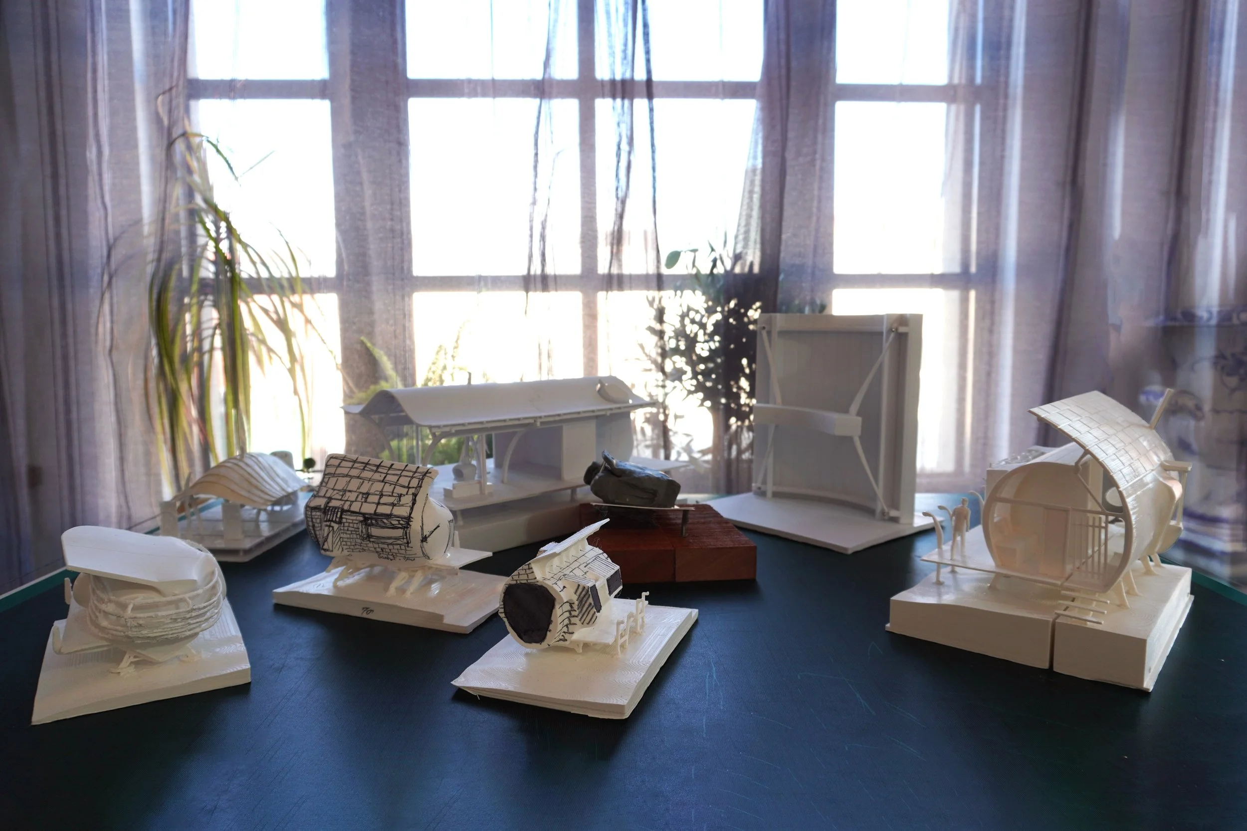 A selection of early sketch models developed in our studio. Several were 3D printed and then hand-worked to test ideas, mark changes, and refine the design intent. Physical models like these allow us to explore proportion, structure, and light in a more intuitive way than digital tools alone.